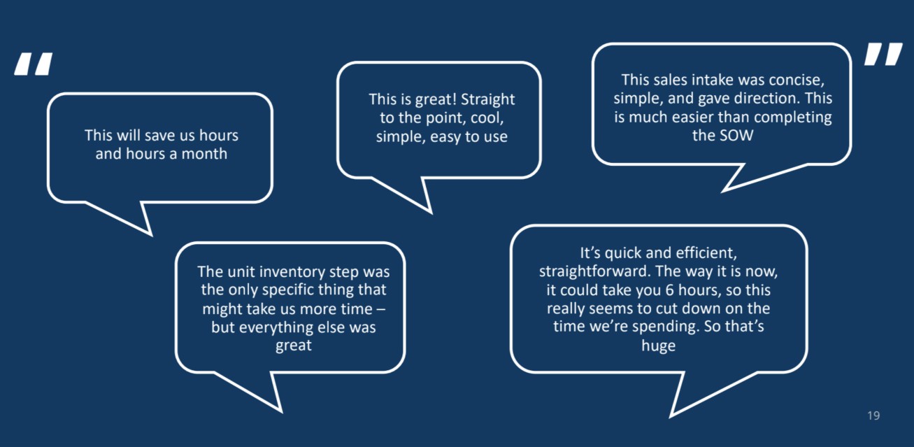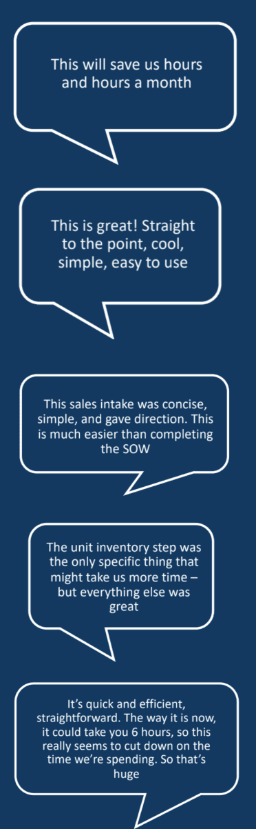 After collaborating closely with the Front-End Engineer to ensure UI quality, usability, and aesthetics, Phase 0.4 of OSI was rolled out to a select group of users. Initial feedback was overwhelmingly positive: • An executive marveled at the efficiency: “it’s just amazing that they can do now in only 10 seconds, what before may have been a 20-30 minute lift.” • Users appreciated the visually appealing and responsive nature of the web app.