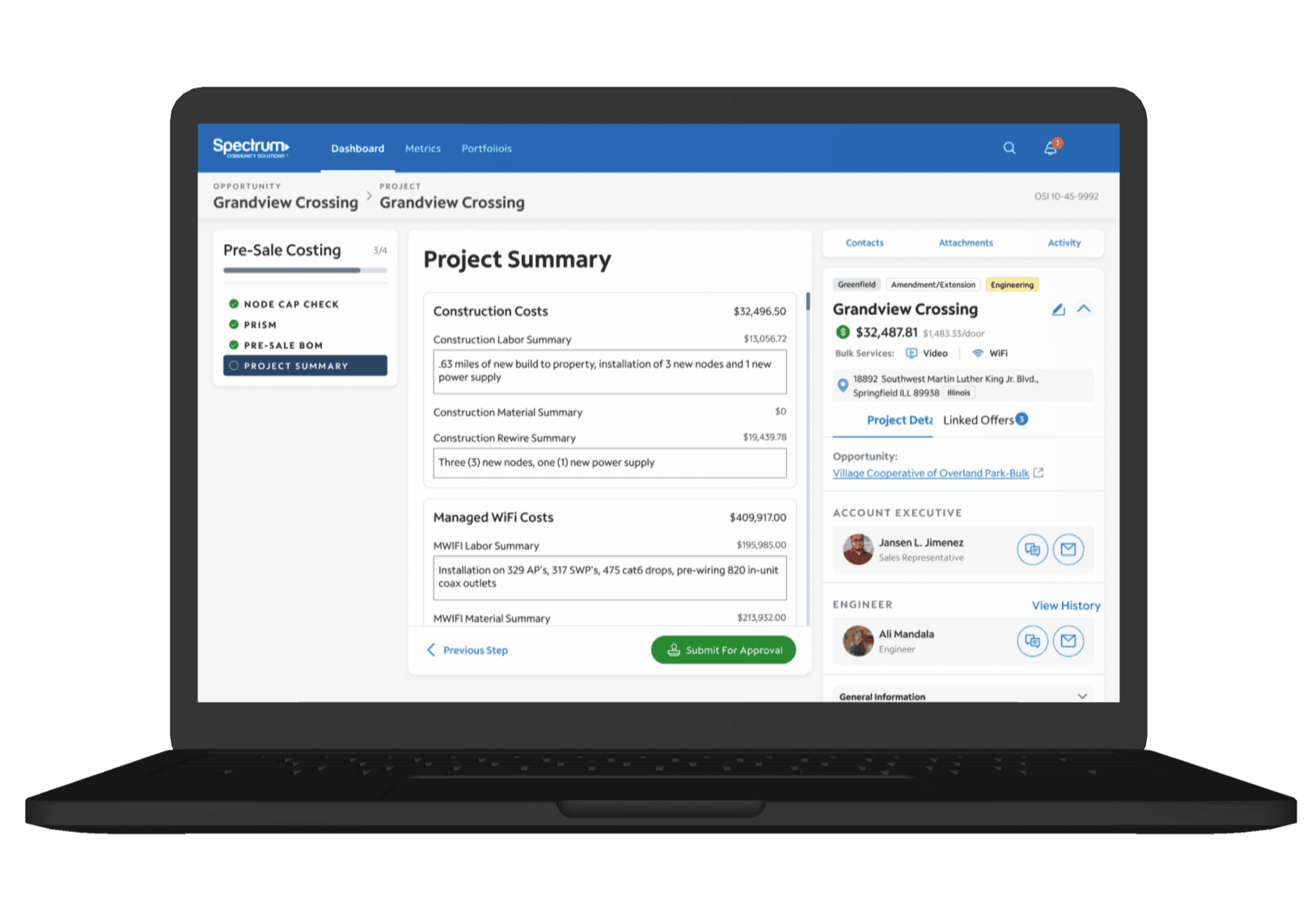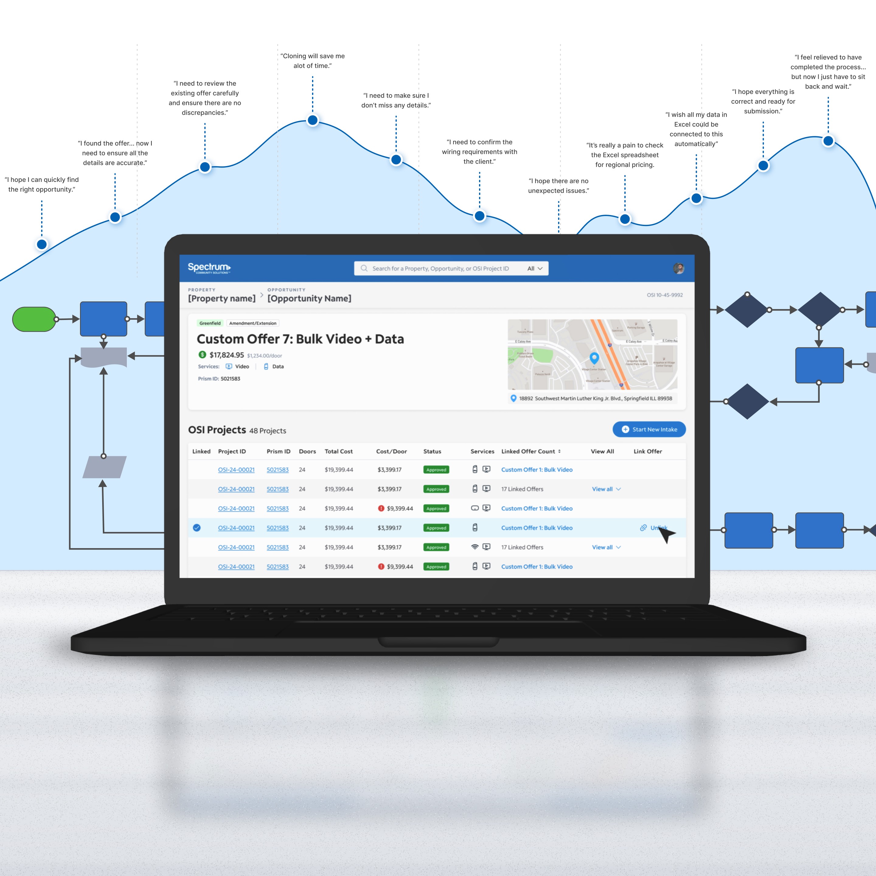 Spectrum's Community Solutions Department, a key player in residential broadband services, needed a greenfield solution to unify its pre-sales costing and design processes. The existing workflow relied on disparate spreadsheets and tools, leading to inefficiencies, manual errors, and high operational costs. Our team was tasked with building a centralized web hub that integrated various platforms, reducing manual work and saving Spectrum time and resources.