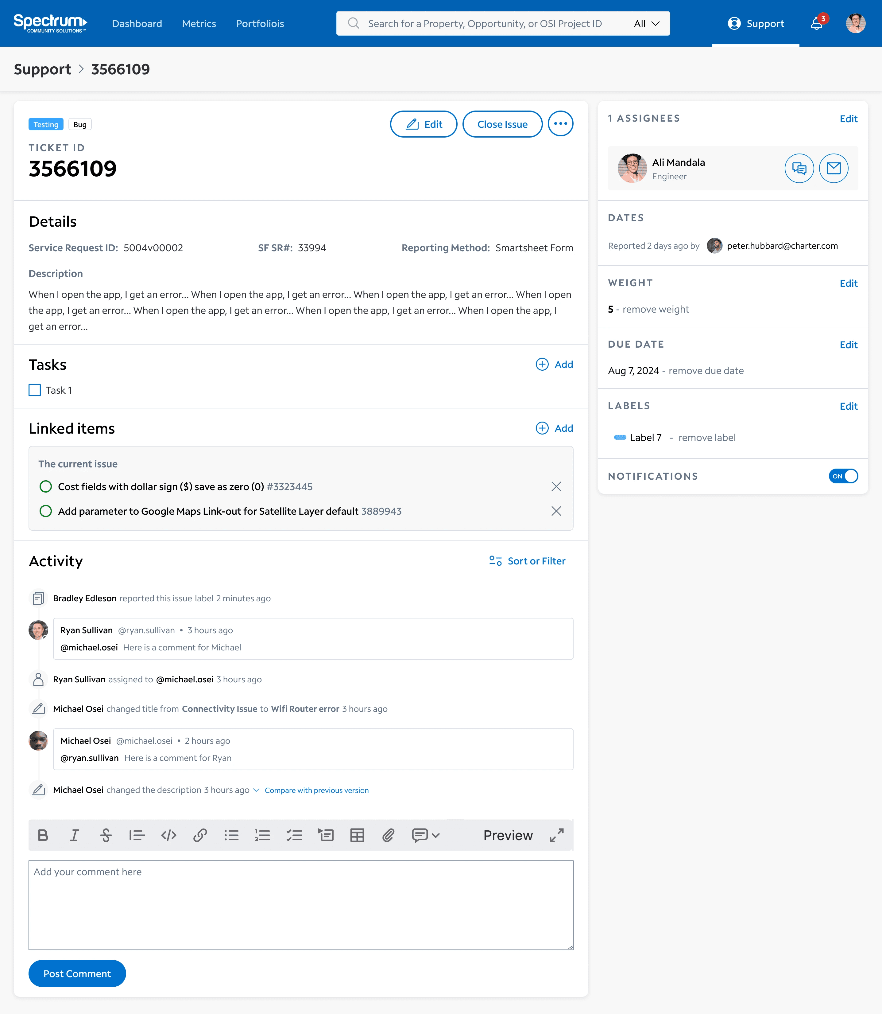 When viewing a support ticket, the user is given a plethora of information, and can take a variety of actions: • Update ticket info • Post a comment • Assign a team member