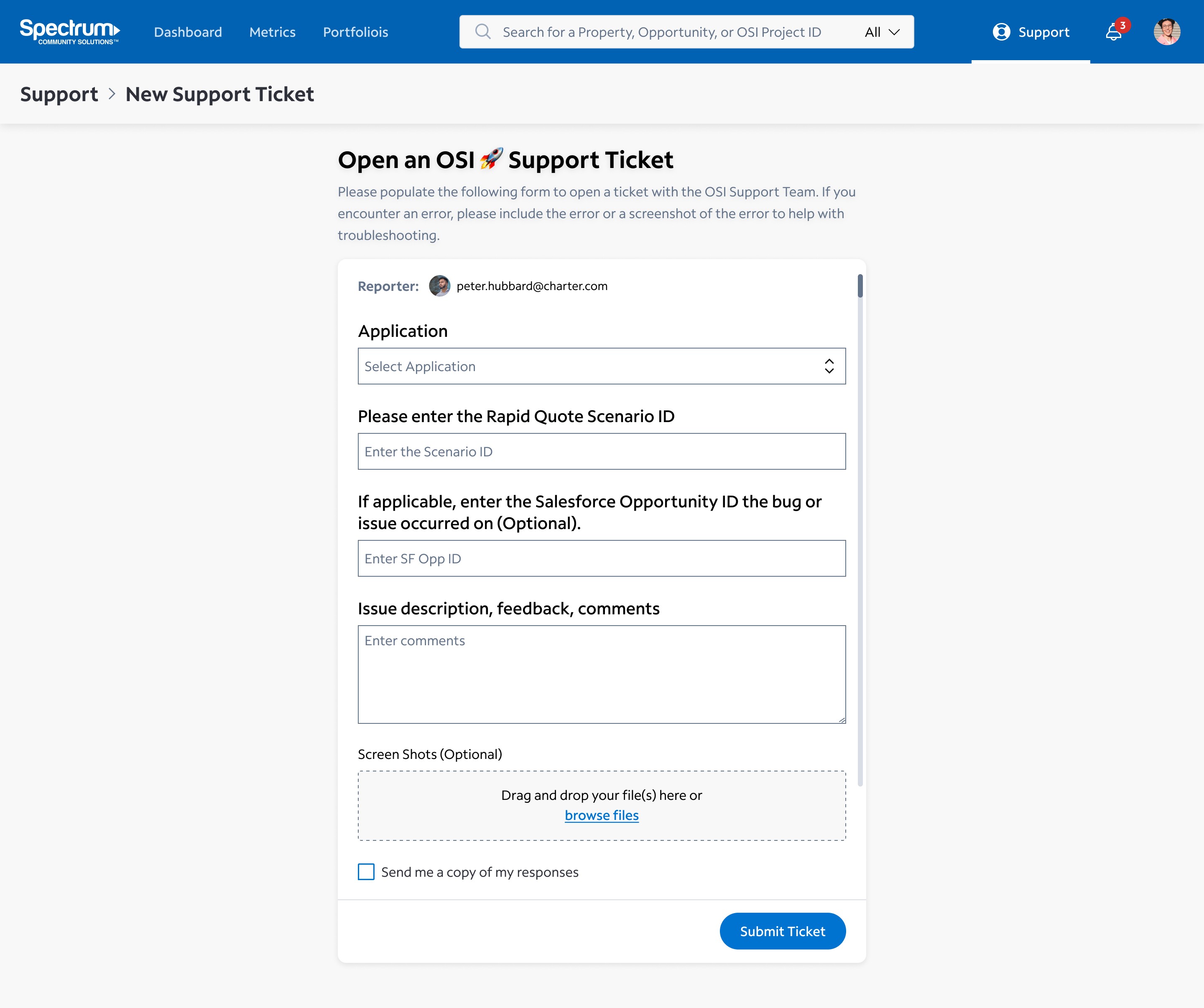 This form allows the user to request help from the department's Support Team. Users input details about the issue, add screenshots, and submit a ticket.