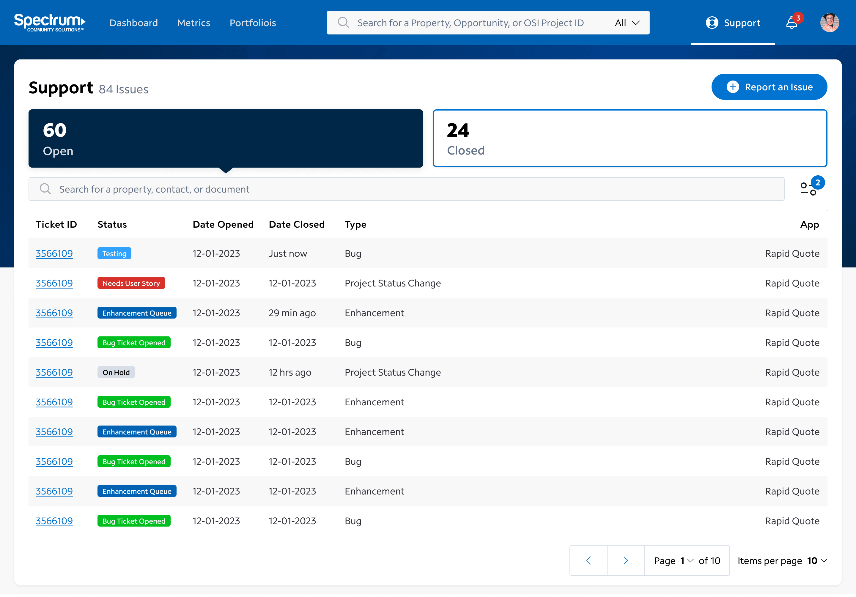 Support team members use a dashboard with a similar layout to the OSI Engineering dashboard. They see an overview of open and closed tickets, search, and filter issues.