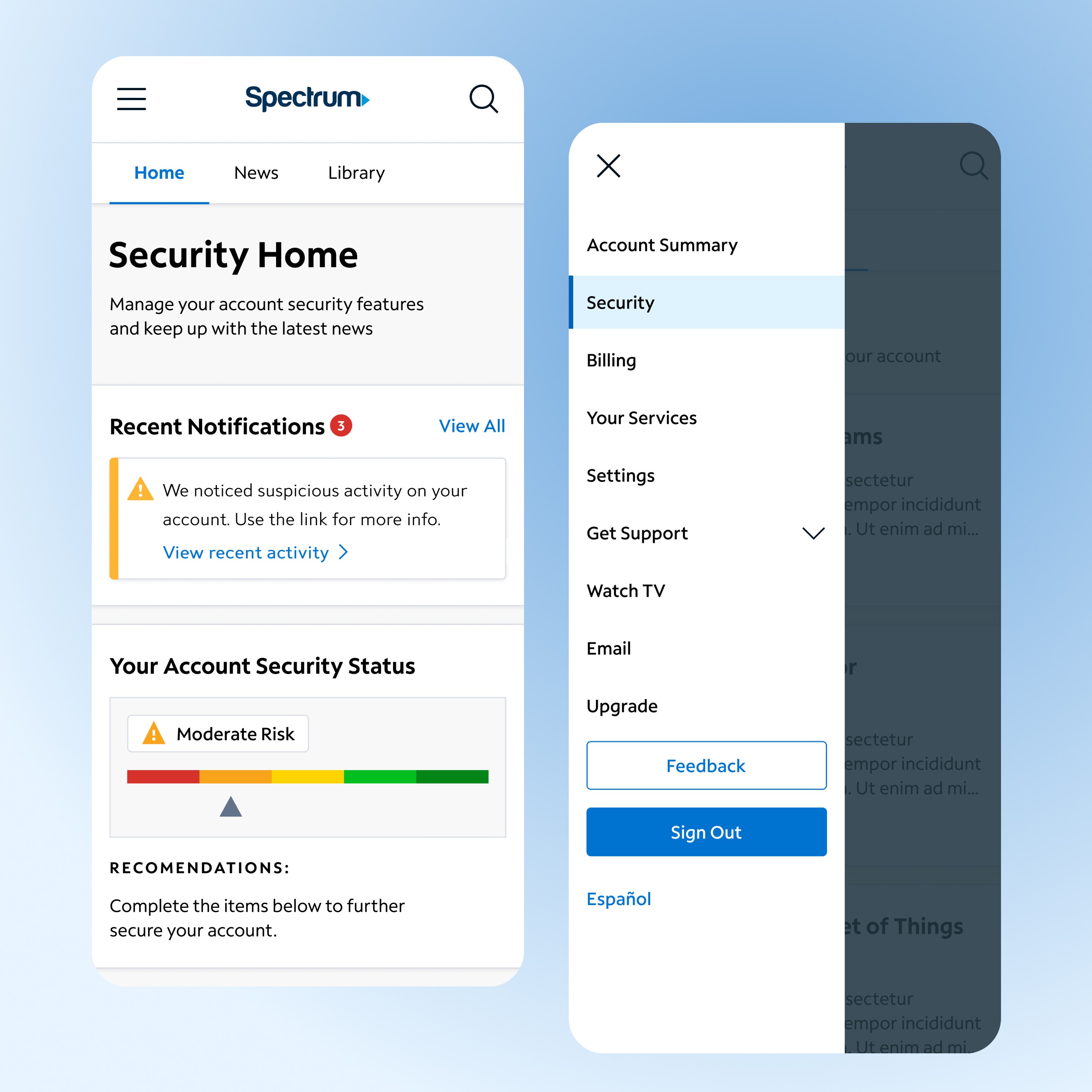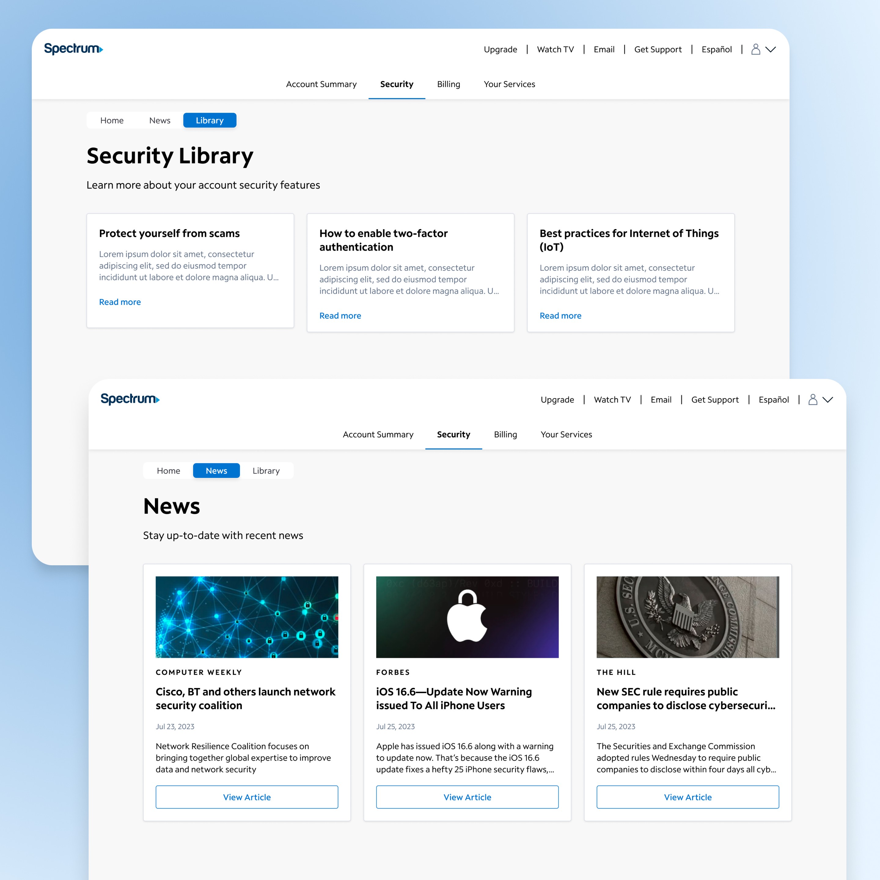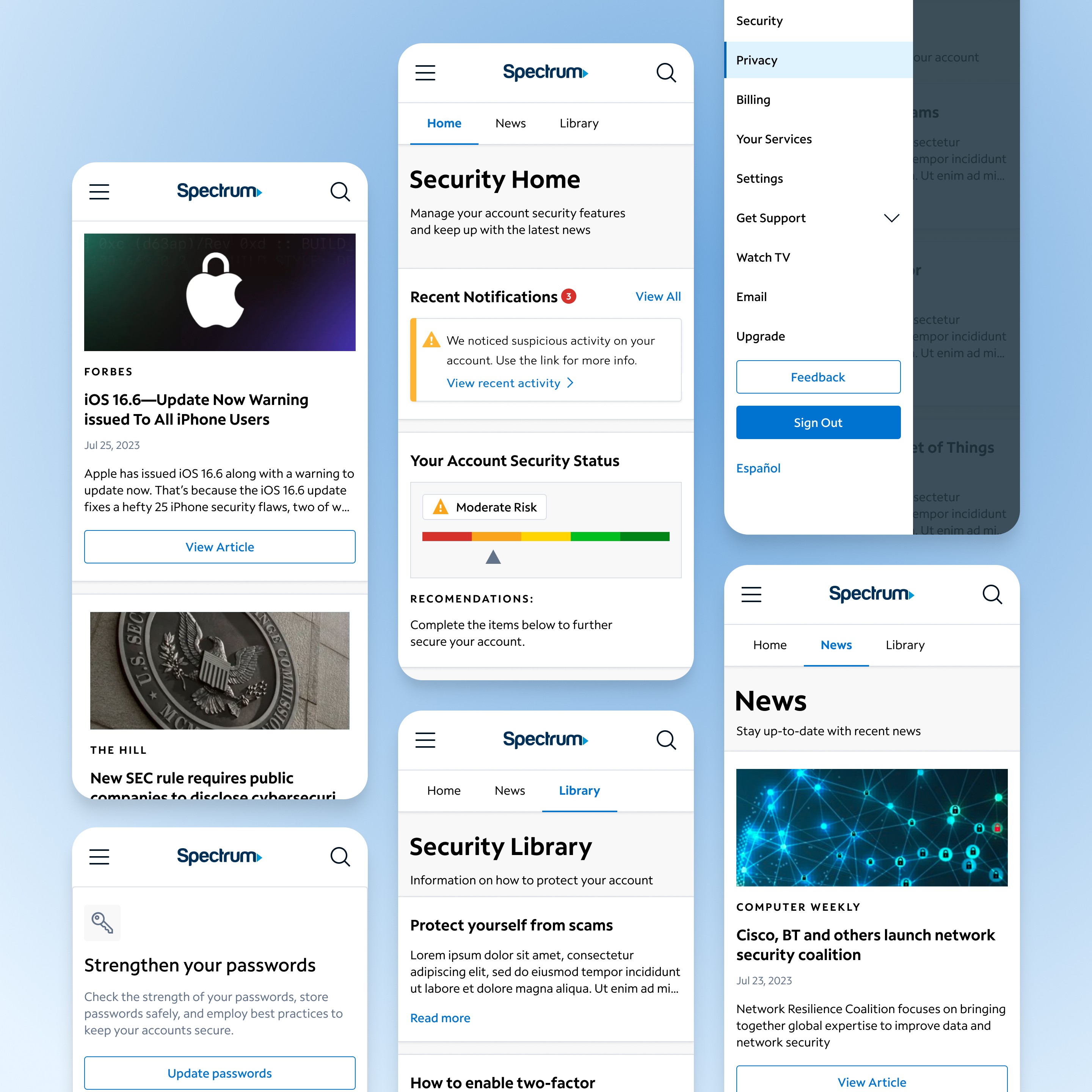 Designed a Privacy Portal concept for Spectrum’s mobile and web platforms, giving users a centralized hub to monitor and manage account security. Features included a Home tab with security status and actionable alerts, a News tab with relevant industry updates, and a Library with best practices on scams, 2FA, and data protection. The design improved user awareness and overall experience.