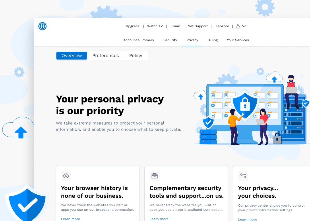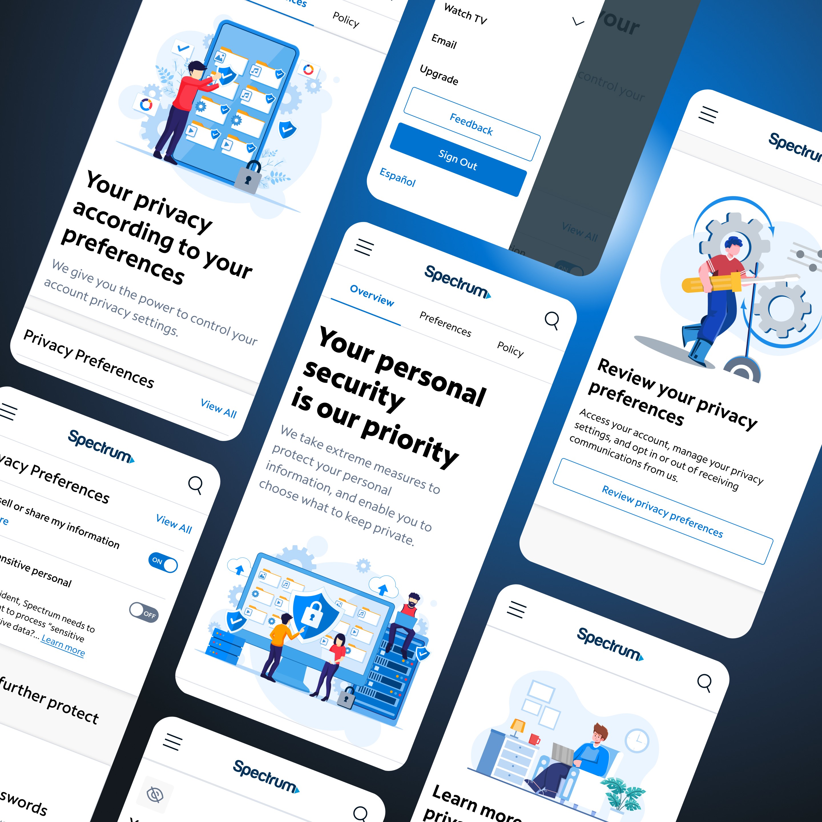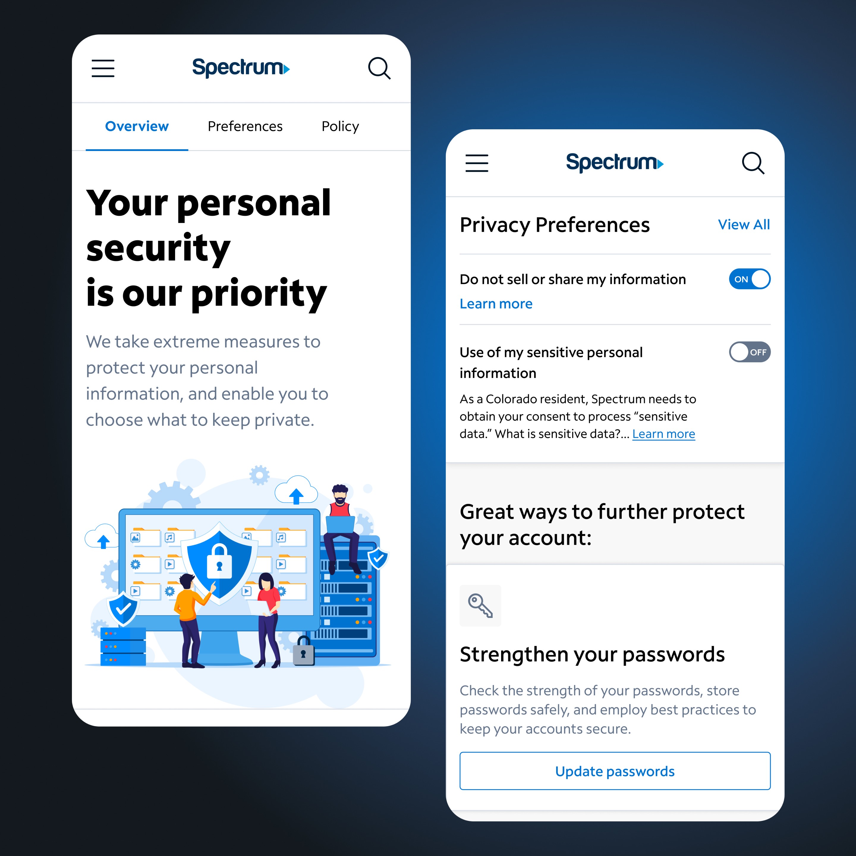 Led design of Spectrum’s Security Portal for the mobile app and website, giving users control over privacy settings and account security. The portal includes Overview, Preferences, and Policy tabs, featuring actionable insights, toggle controls, and guidance on securing their account—all presented through a clean, informative interface.