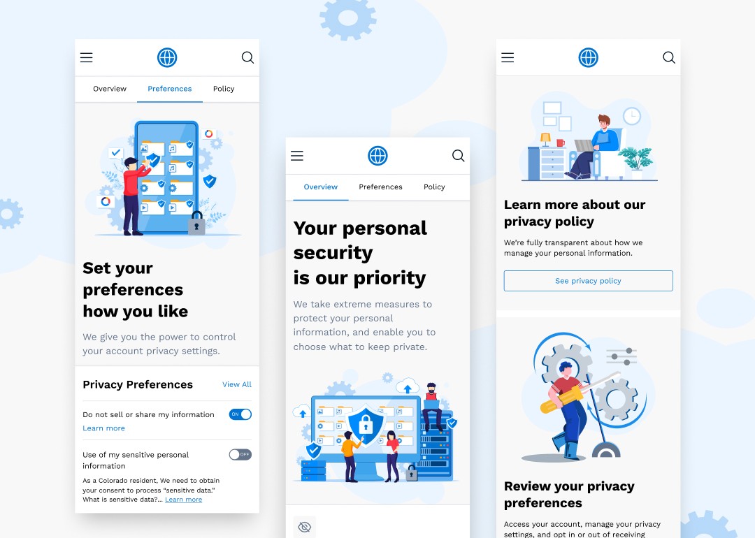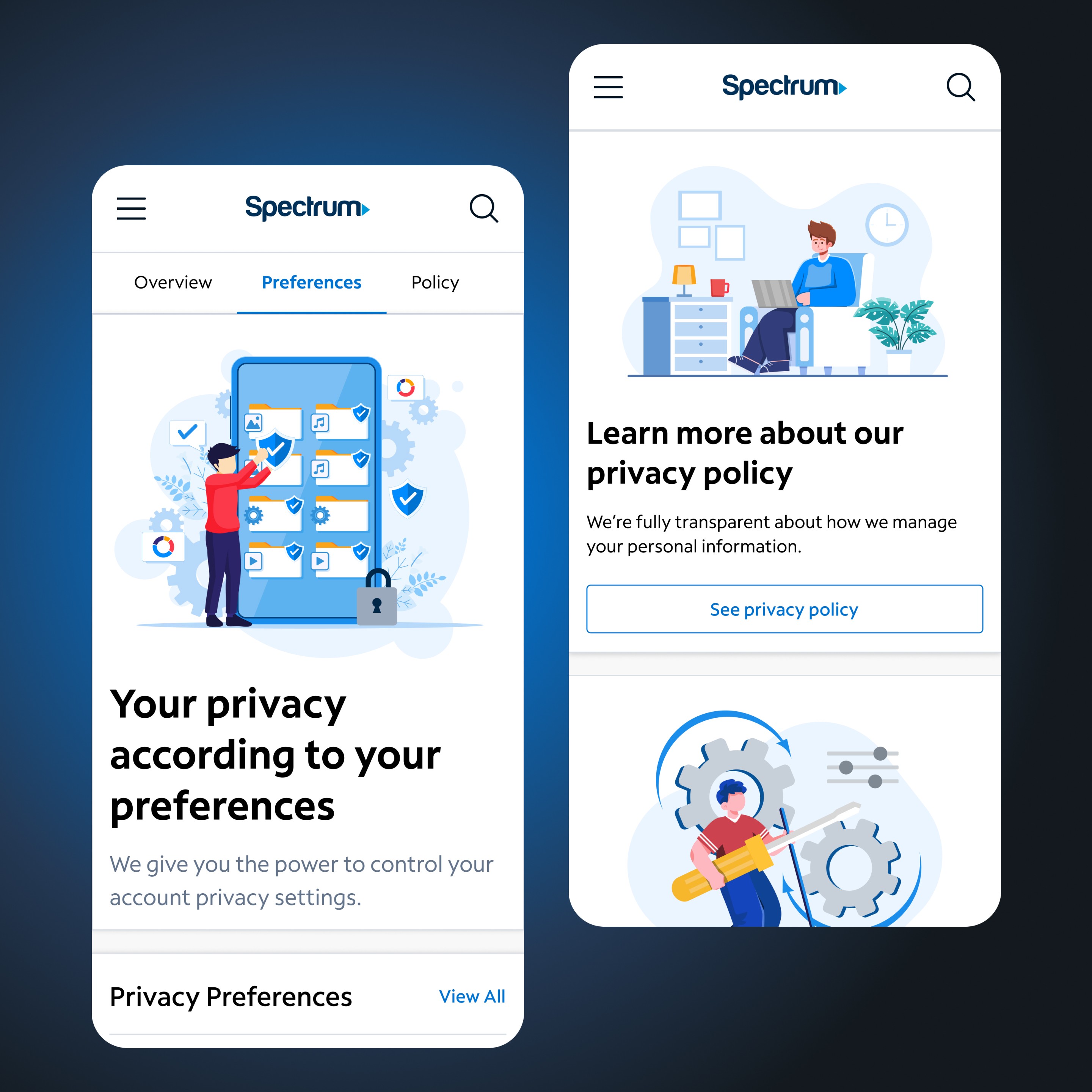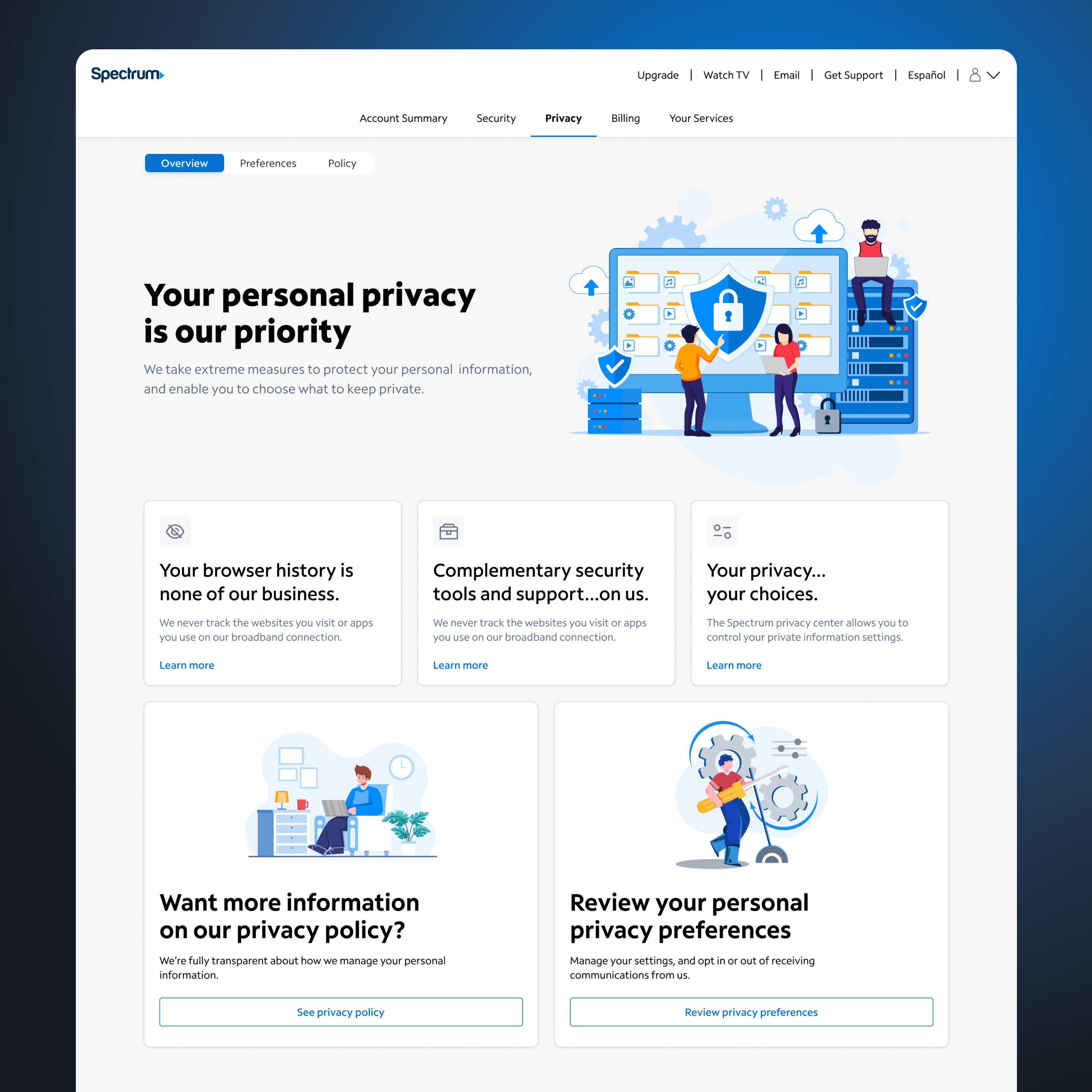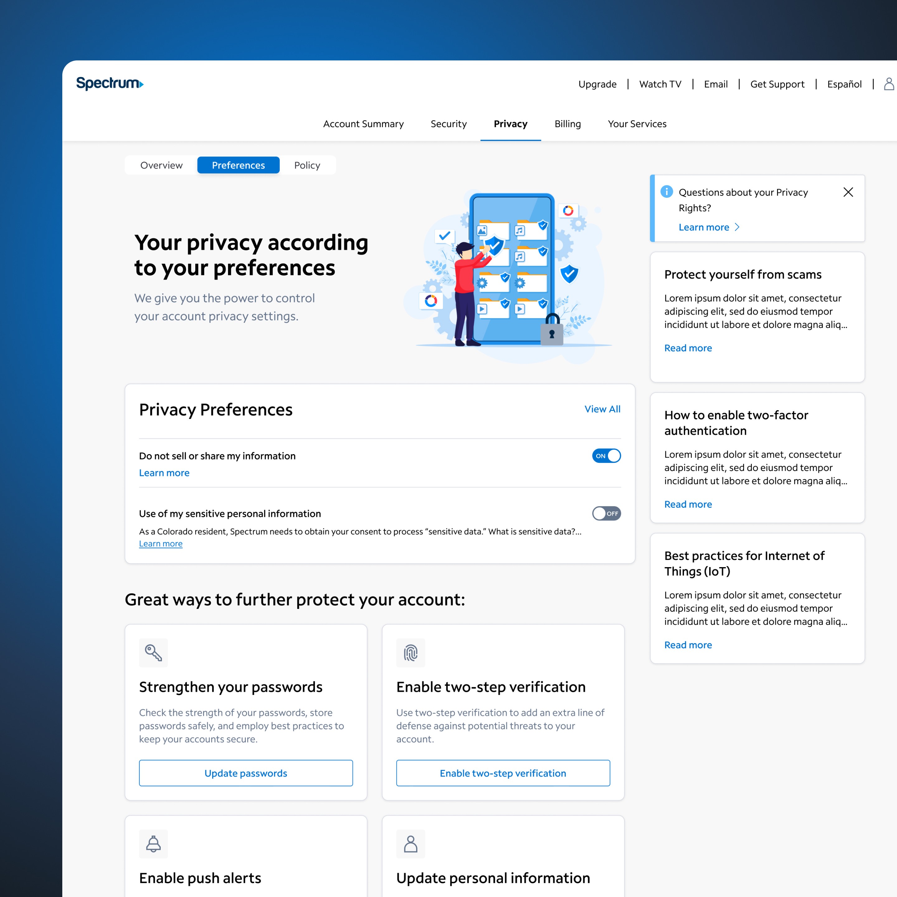 Led design of Spectrum’s Security Portal for the mobile app and website, giving users control over privacy settings and account security. The portal includes Overview, Preferences, and Policy tabs, featuring actionable insights, toggle controls, and guidance on securing their account—all presented through a clean, informative interface.