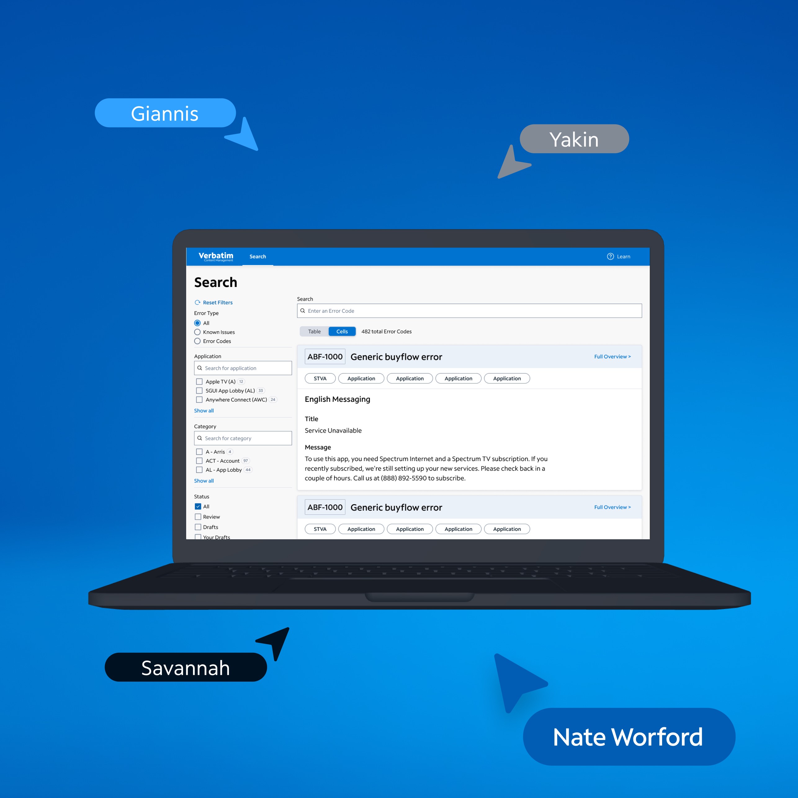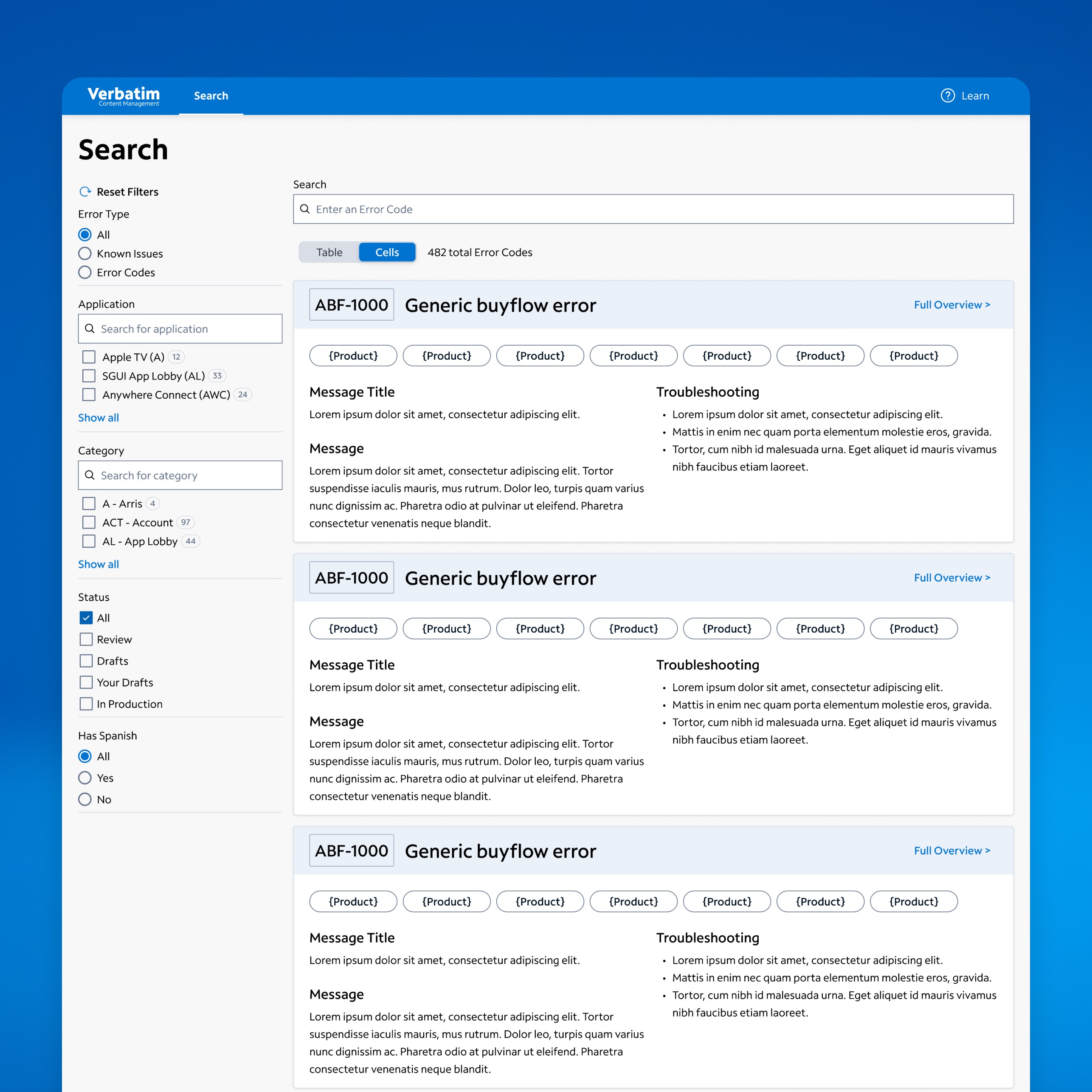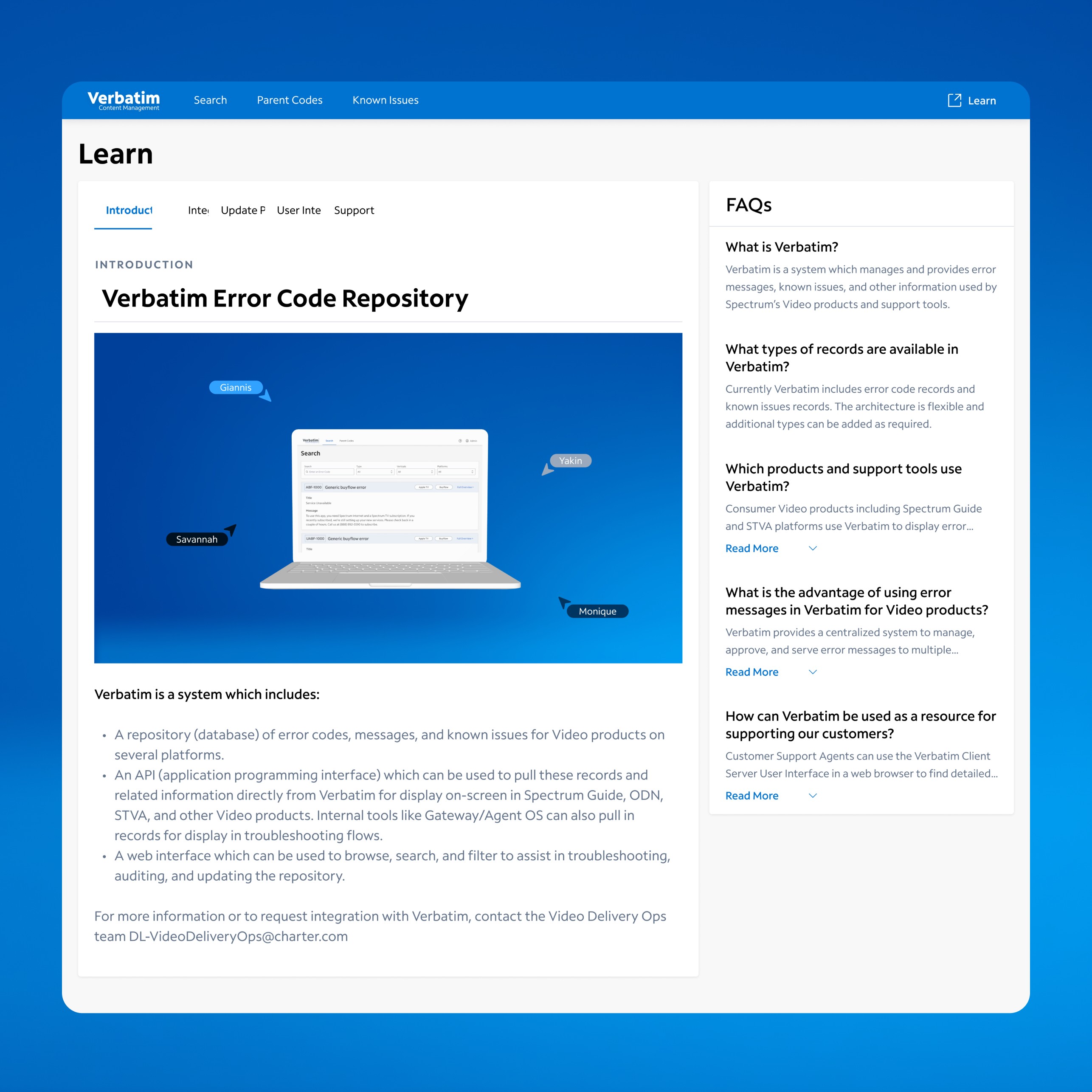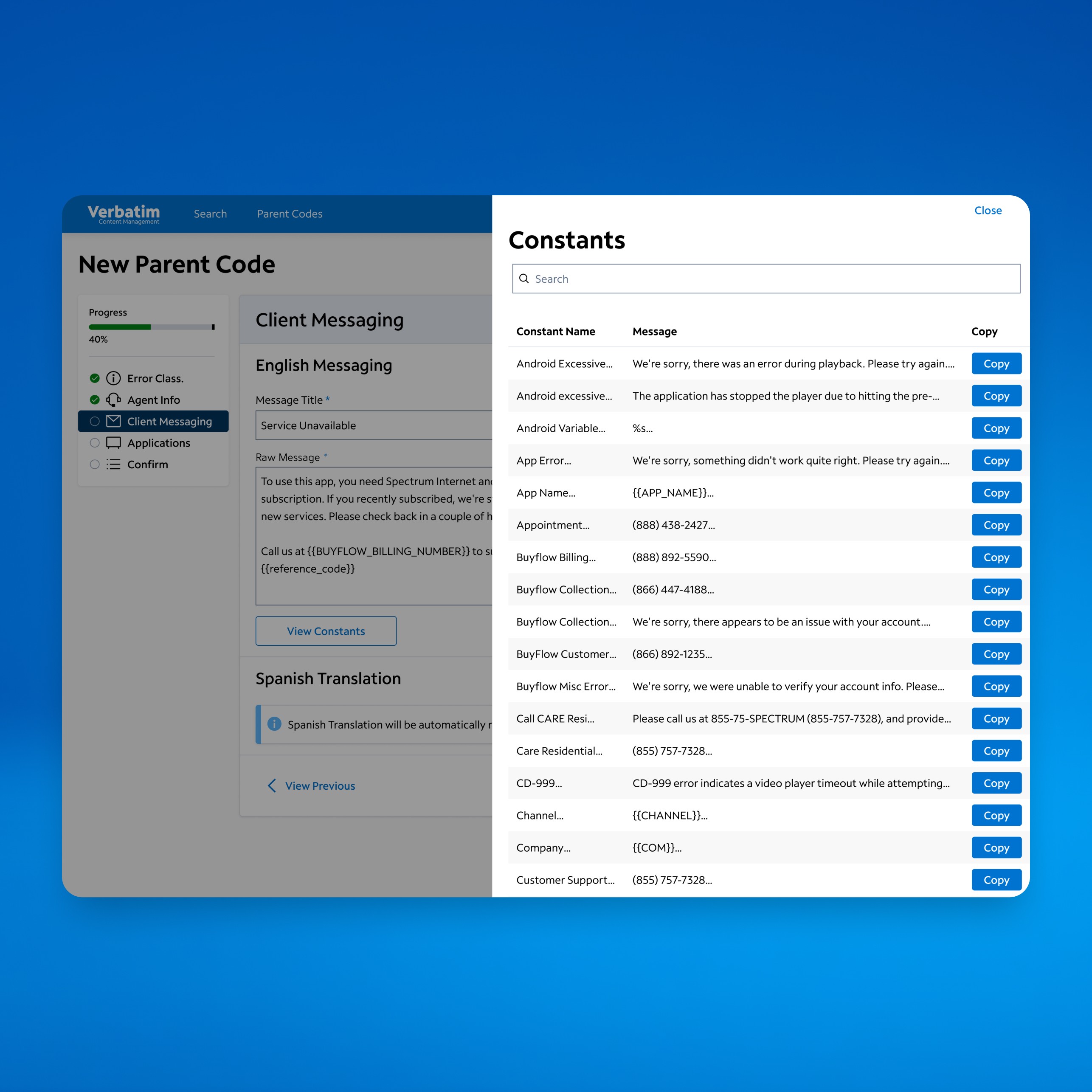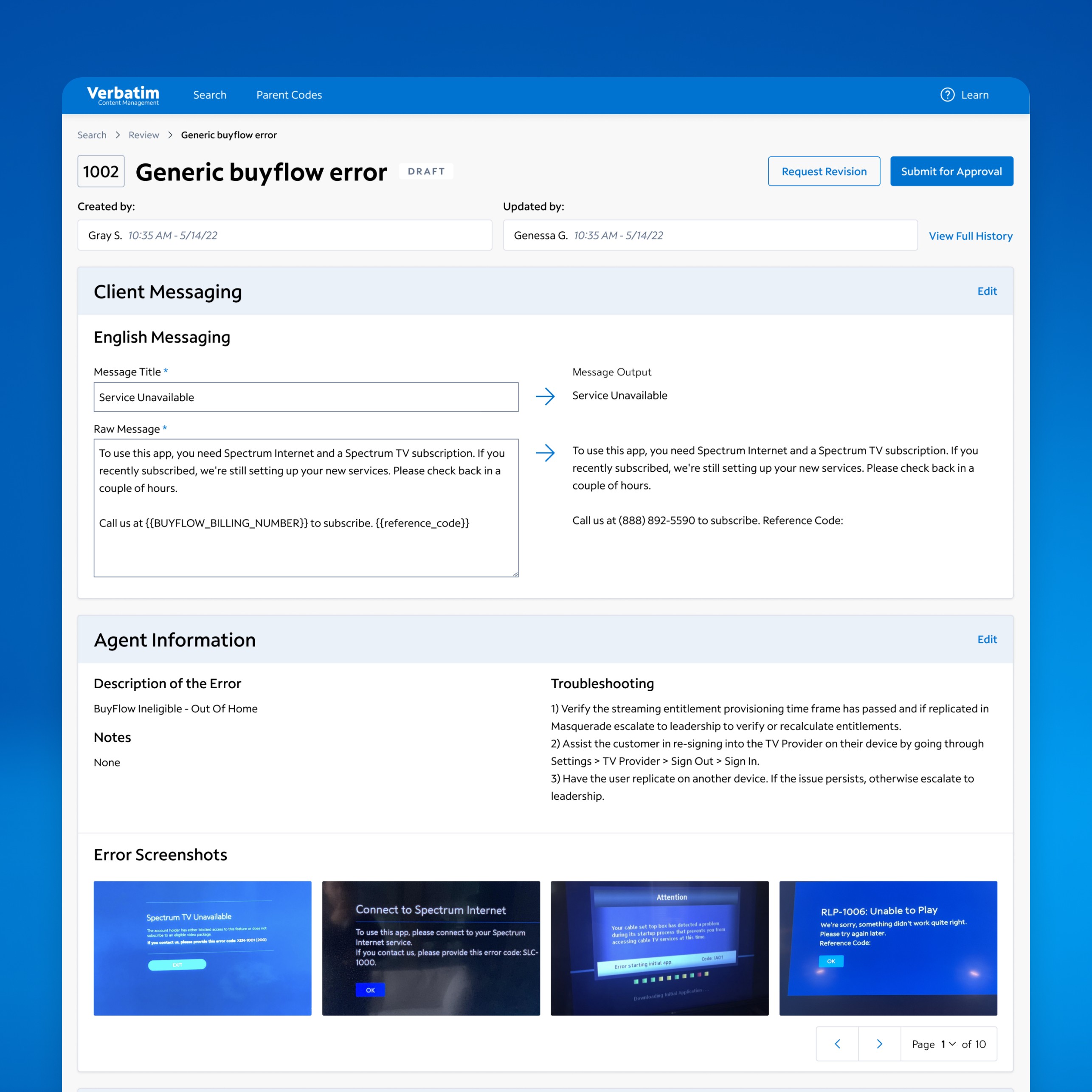 Redesigned Spectrum’s Verbatim tool, used by 10,000+ stakeholders to manage customer error codes. Improved usability and modernized the interface for faster, clearer workflows. Introduced contextual error screenshots—a key enhancement that helped users resolve issues more efficiently.